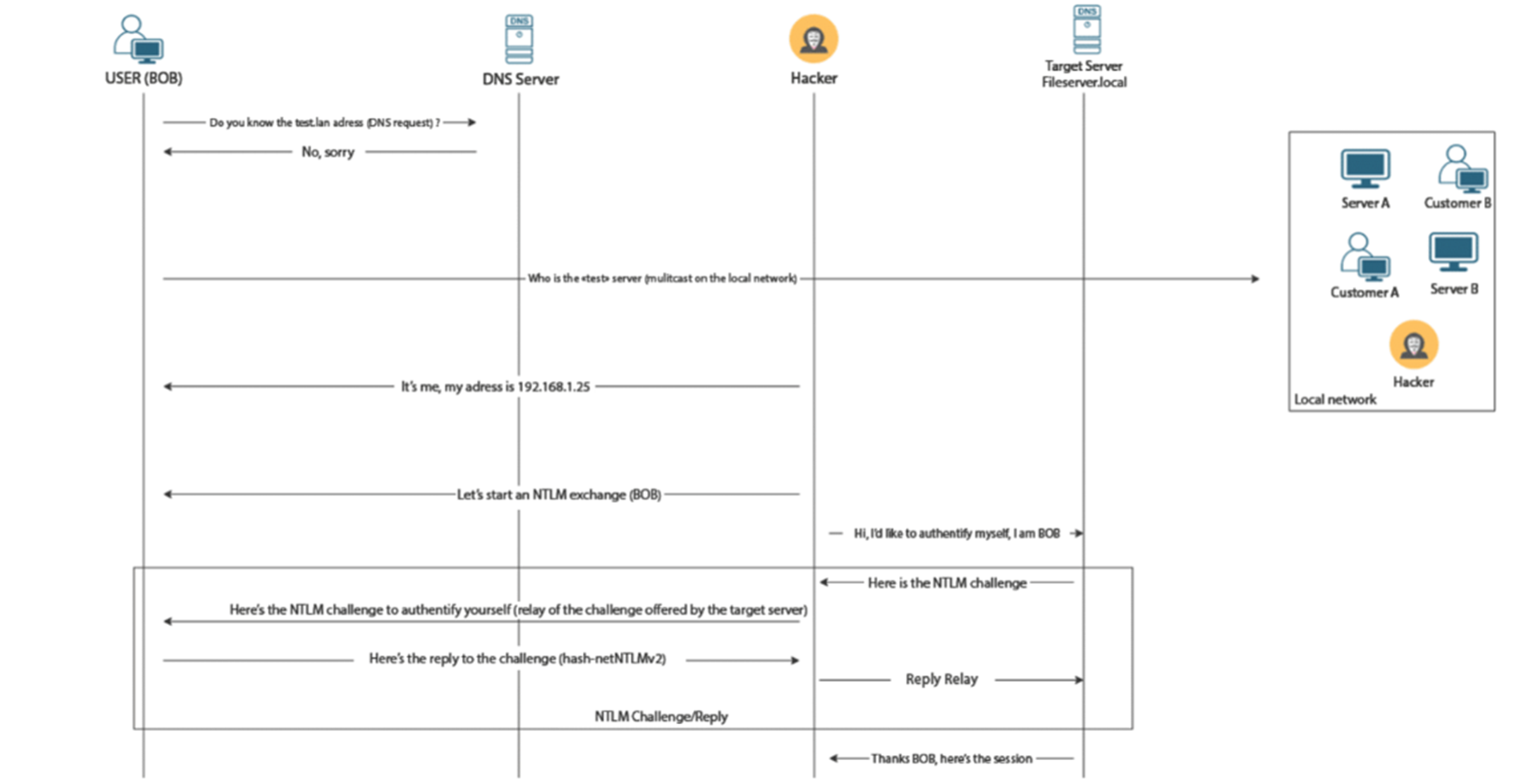 Once this authentication request has been retrieved, the attacker can relay it to a server to impersonate the client. This process is clearly explained in the diagram below: