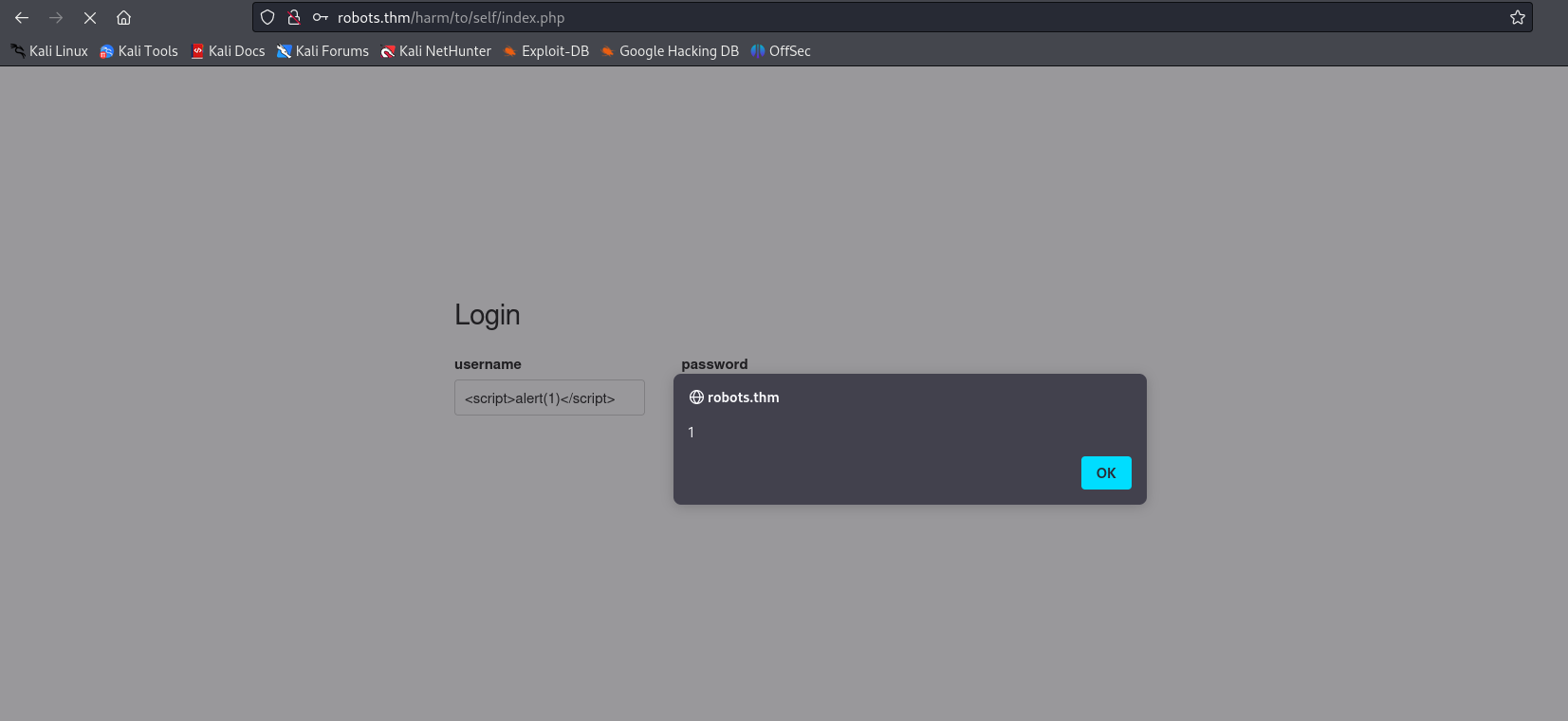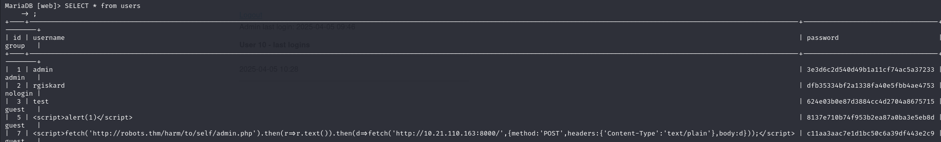 We can see that the admin account has recently logged in, and we can also see that our name is included on the page. So it may be possible to perform a stored XSS to steal the admin cookie. We can check this by creating an account with a JS command: