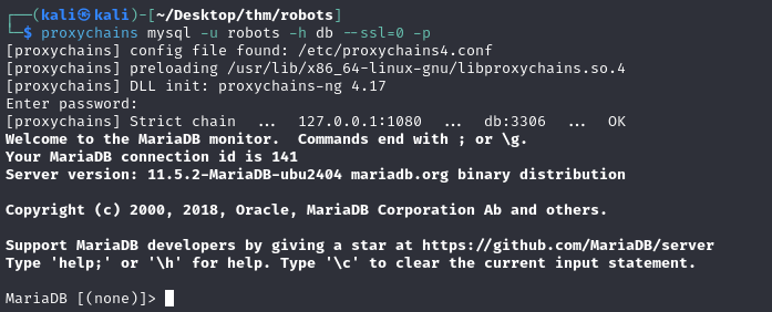 This database is accessed by establishing a sock with the compromised machine and using proxychains: