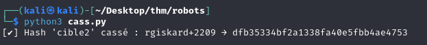 Based on the mdp hashes of our accounts, we can see that the mdps are of the form md5(md5(username+ddmm)). So, using this information and the logic with which passwords are created, we can create a script to break one of these hashes: