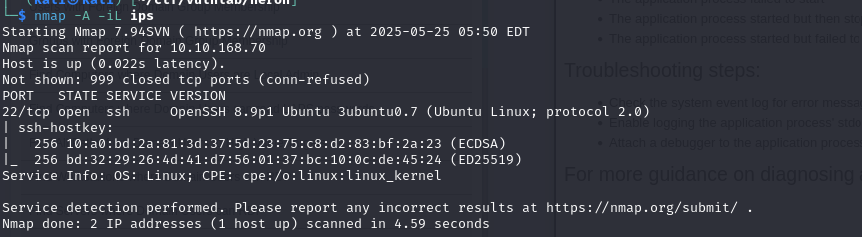 The scan shows that 10.10.168.69 has no accessible ports, probably due to a firewall. On the other hand, 10.10.168.70 has port 22 open. This suggests that we should start by connecting to the Linux machine via SSH.