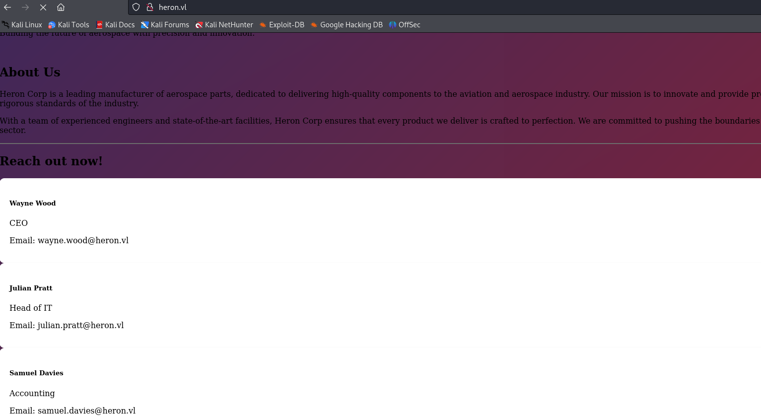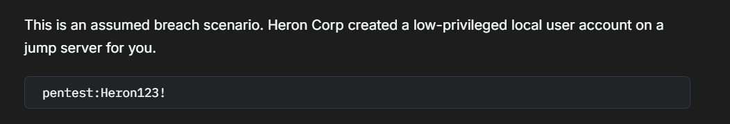 The Wiki page tells us that this is a supposed compromise scenario. Heron Corp provides us with login credentials for the penetration test:
