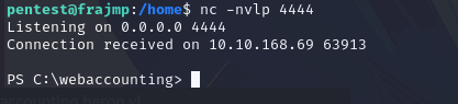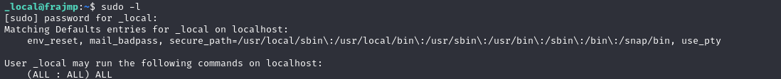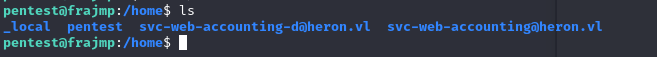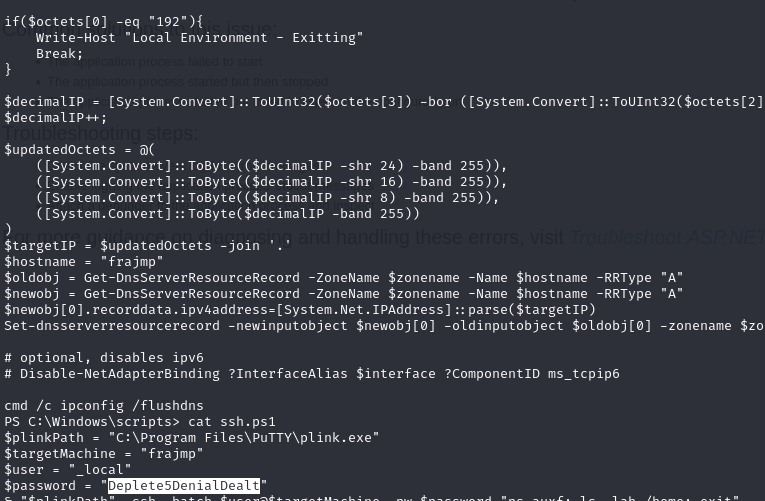 Once you’ve obtained a shell, you can browse the various DC files. An unusual feature is a scripts folder in C:\Windows. In the latter, we discover a file ssh.ps1 containing the credentials for the _local account used to connect to frajmp via ssh:
