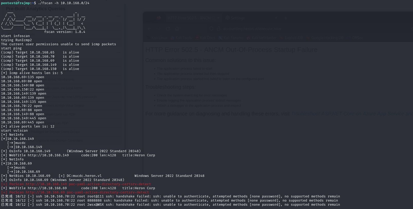 Next, I tried to run an nmap scan with proxychains to identify the ports open on the DC, but this took far too long. So I decided to enumerate the DC directly, passing through the linux machine and using the fscan tool: