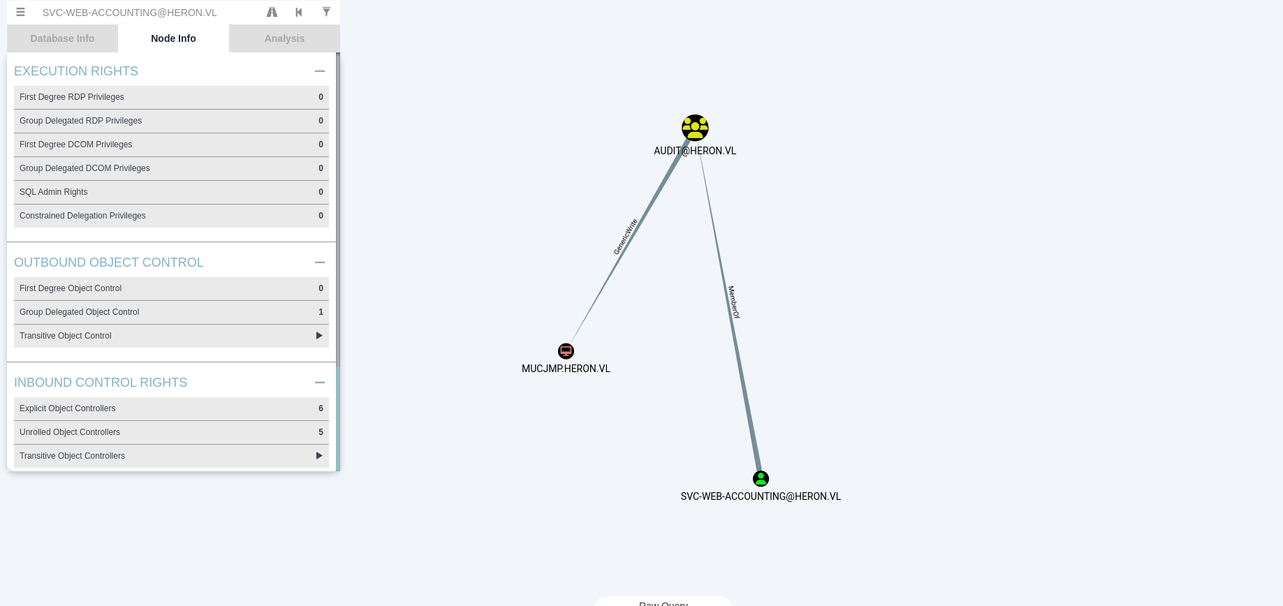 With the recovered account, we can use bloodhoun to enumerate the domain via proxychains. Unfortunately, the account we’ve retrieved doesn’t have any special rights, but we can see that the SVC-WEB-ACCOUNTIG account has an SPN and that it has GenericWrite rights on the linux machine: