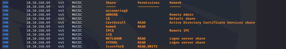 Using smbclient with samuel.davies’ credentials, we can list the shares accessible on the dc: