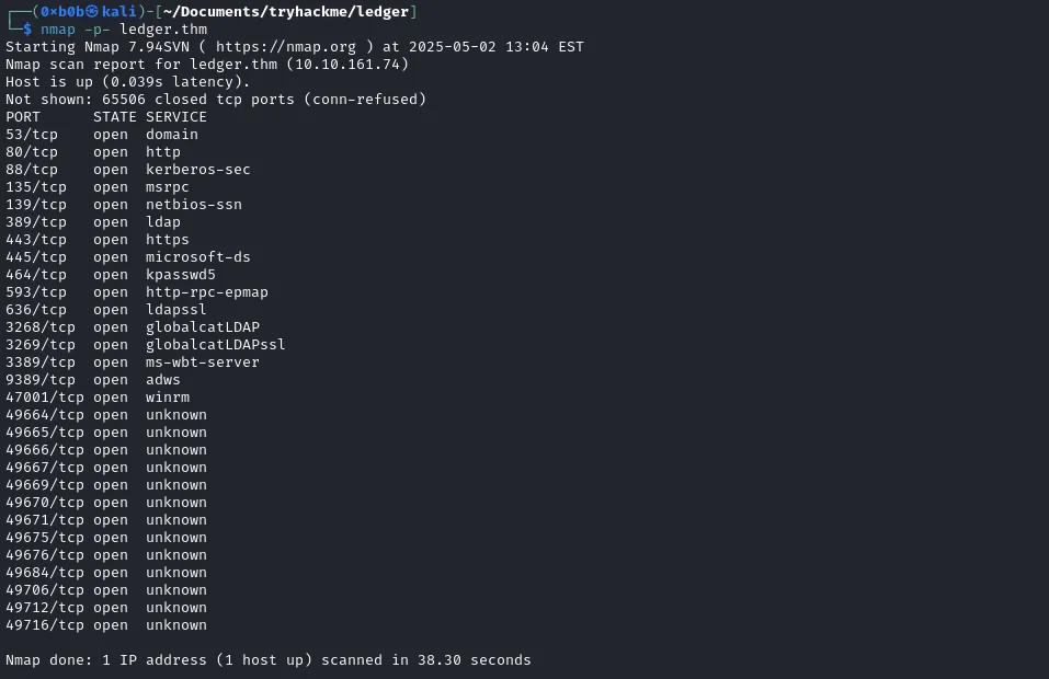 As usual, we start by running an nmap scan to identify the services exposed on the machine. We can see straight away that the machine is a domain controller, as it has all the ports typical of a DC.