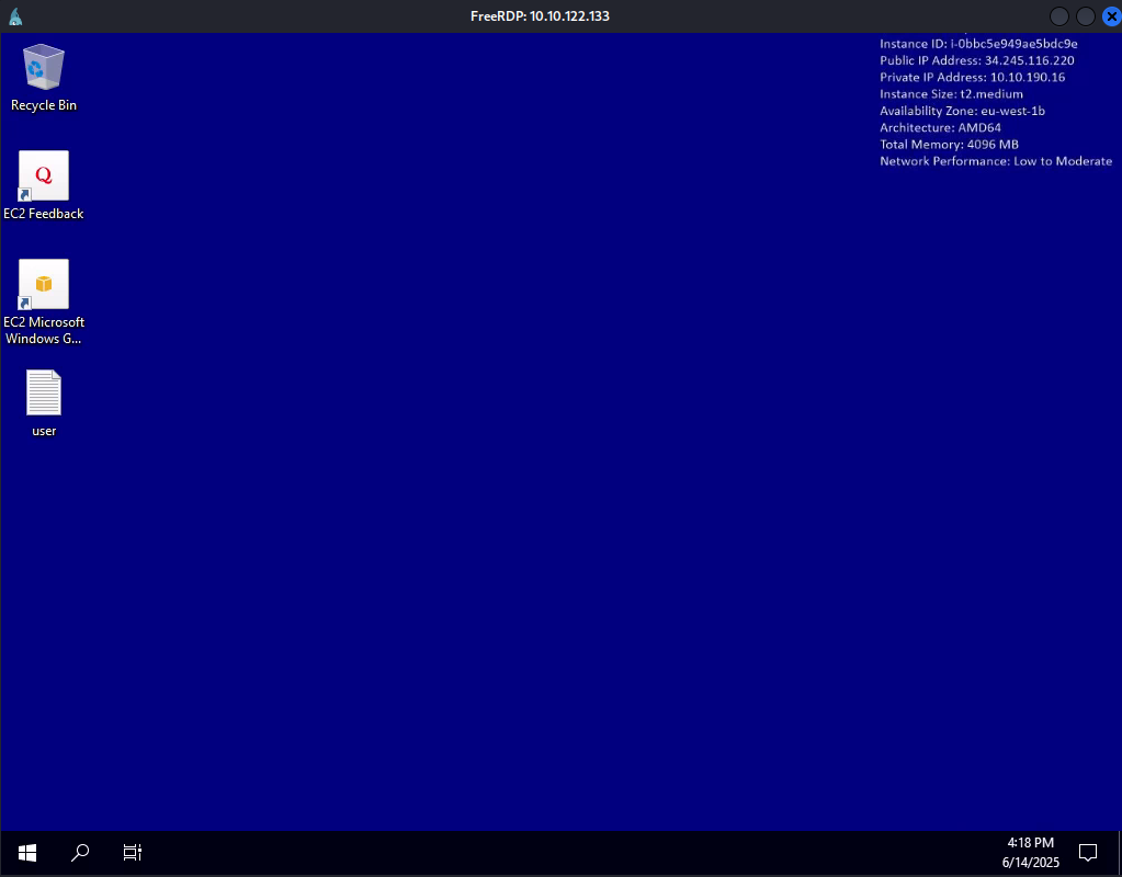 So, using these identifiers, I obtain RDP access to the machine and retrieve the first flag:
