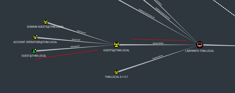 An analysis of the relationships between domain objects using BloodHound reveals another way of compromising the domain. In fact, the guest user has GenericWrite rights on the DC machine account, enabling us to perform a Resource Based Constrained Delegation attack.