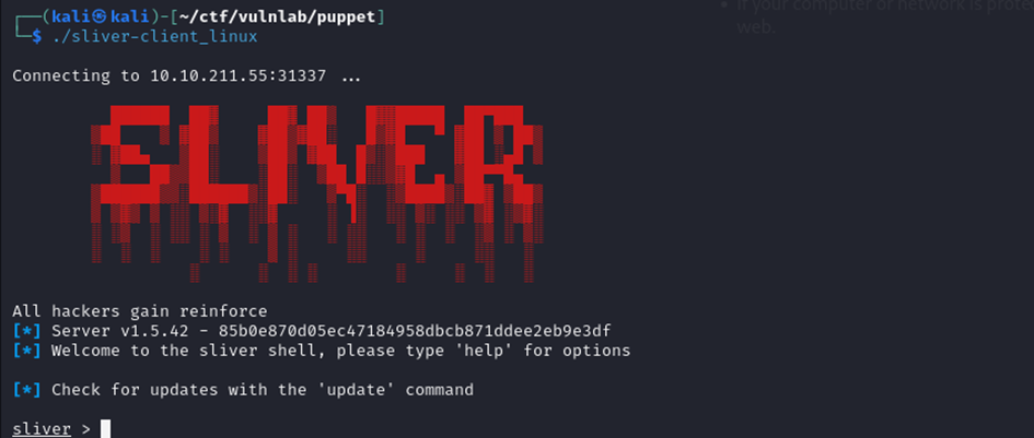 By replacing the local IP address with the address of the Linux machine and launching the sliver client, it is possible to connect to the C2 server.