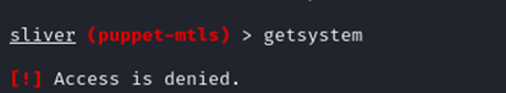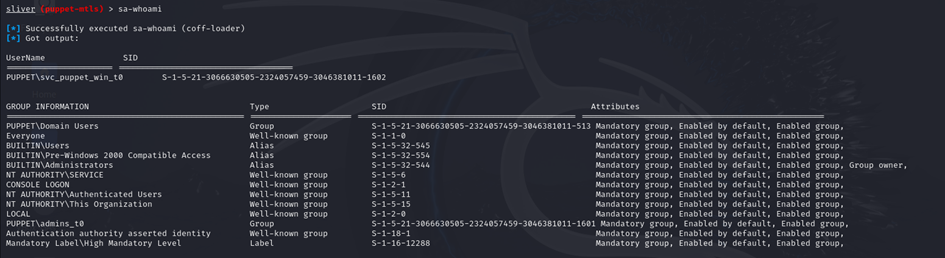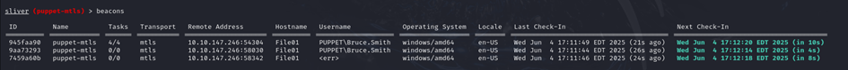 sliver > beacons ID Name Transport Hostname Username Operating System Last Check-In Next Check-In ========== ============= =========== ========== ==================== ================== =============== =============== 8ed5ce87 puppet-mtls mtls File01 PUPPET\Bruce.Smith windows/amd64 23s 8s