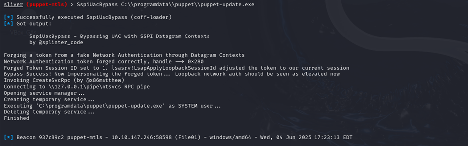 So, by adding SspiUacBypass to the sliver extensions, you can run it directly on any session you have.