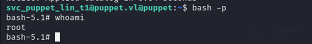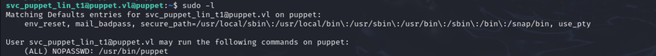 Next, we identify that puppet can be launched with root privileges: A quick search on GTFOBINS yields the following command to set the SUID bit on bash: