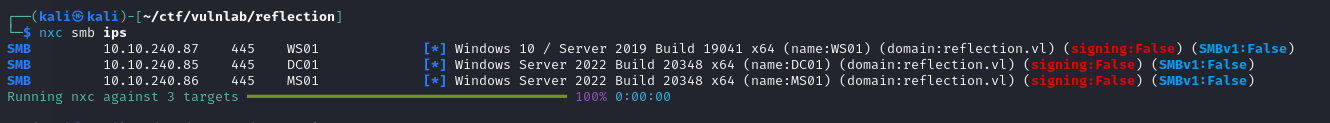 To start with, I ran an nxc scan to identify the machines on the domain, which revealed that none of the machines had SMBv1 and the signature enabled