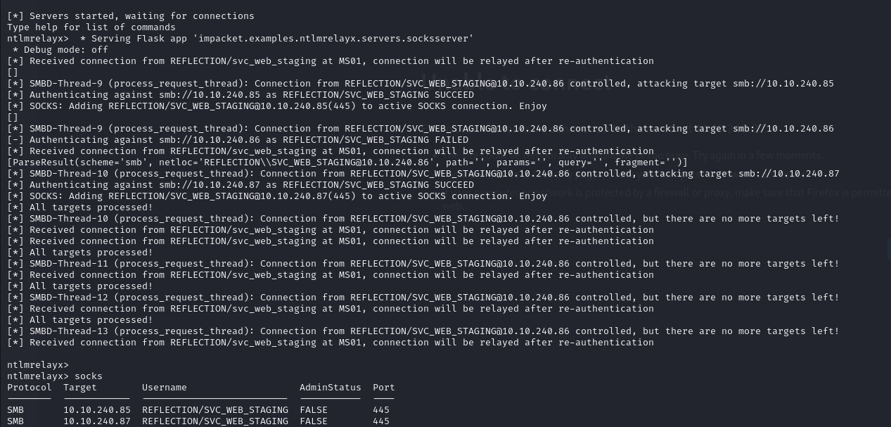 With ntlmrelayx, you can relay authentication to other servers and obtain an SMB sock