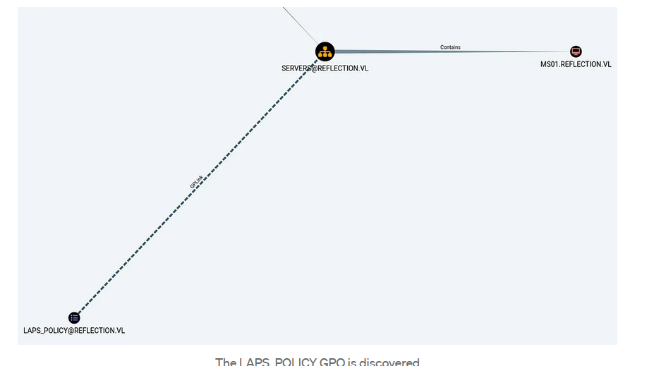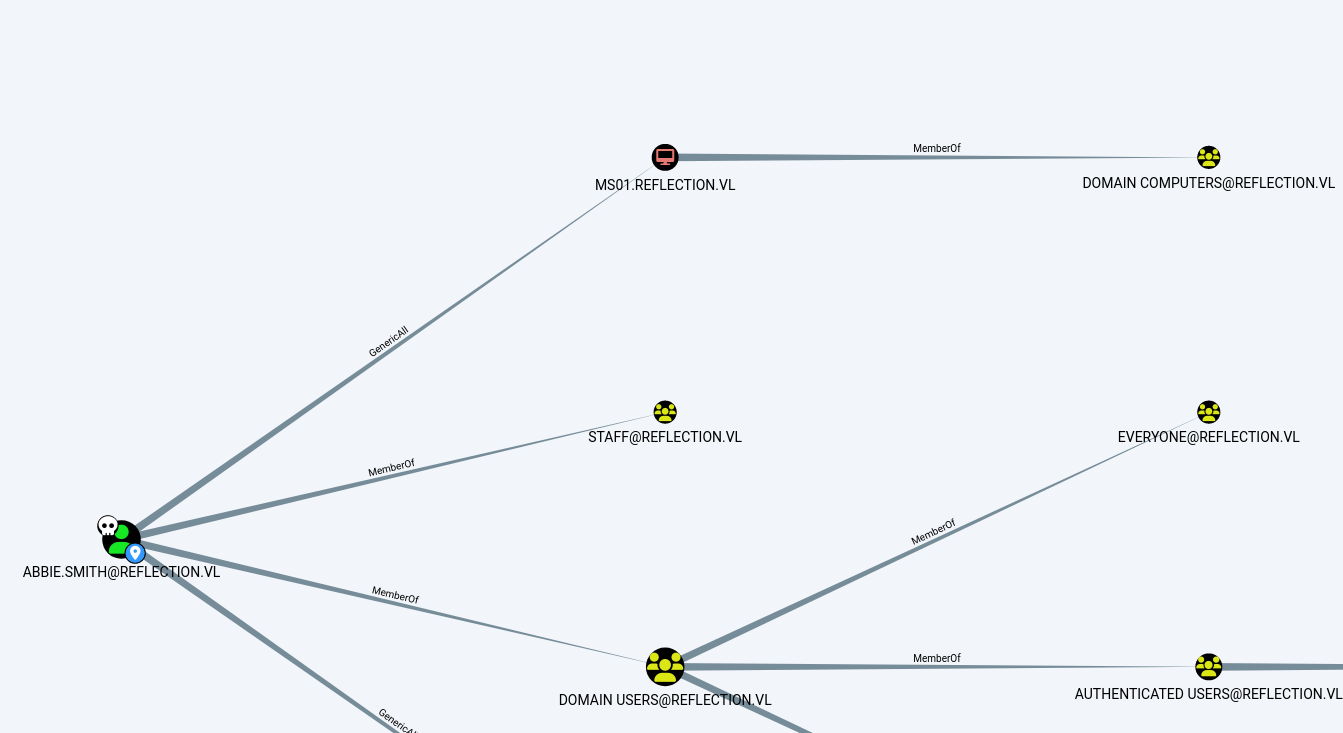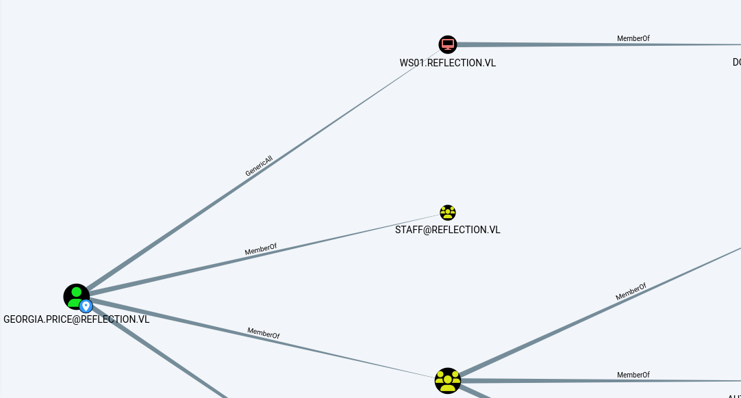 Reflection is a chain of 3 Windows machines: MS01 , WS01 and DC01. Initial access is via an SMB connection to MS01, which provides credentials to access an MSSQL database. These are used to retrieve the database’s service account and, using an NTLM Relay attack, to access the DC’s prod share, which contains the credentials of abbie.smith, a domain account. As this account has GenericAll rights on MS01, it can read the LAPS password and retrieve the credentials of the Georgia.Price account on the machine. As this account has GenericAll rights on WS01, it can compromise the machine with a RCBD attack and retrieve the credentials of Rhys.Garner, which are reused for the DOM_RGARNER account, a domain administrator account.