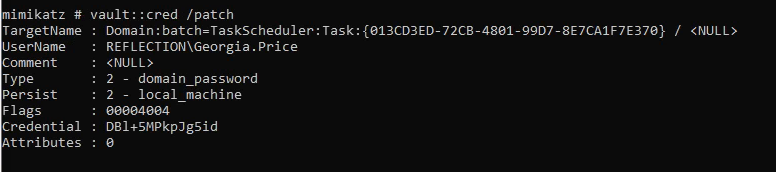 Next, I listed the passwords stored in the vaults, which enabled me to retrieve the password for the account georgia.price, an account used in a scheduled task.