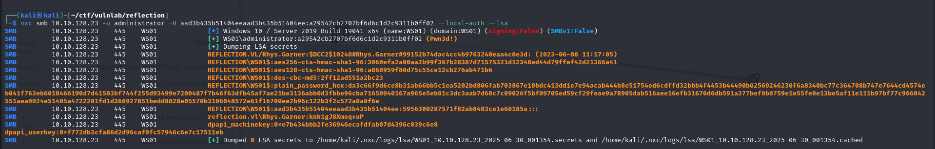 With administrator access restored, I was able to extract the LSA database from the machine and retrieve the password for the Rhys.Garner account.