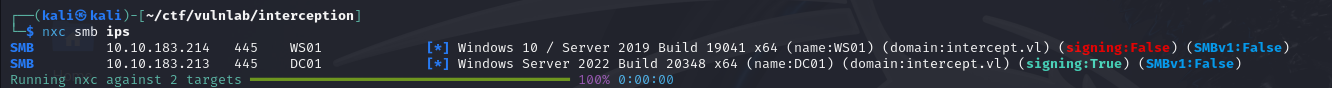 To begin with, we run an nxc scan to identify the various machines on the network. This reveals that one of the machines does not have the SMB signature enabled, opening the door to relay-type attacks.