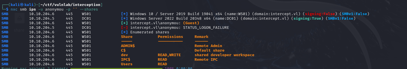 Next, we notice that authentication in anonymous mode and the guest account are disabled. On the other hand, if you authenticate with an account that doesn’t exist on the WS01 server, you’re automatically mapped to the guest account, enabling you to enumerate SMB shares.