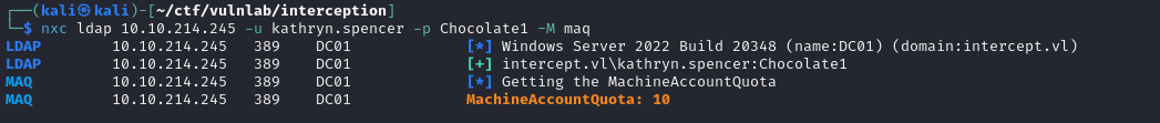 We can see that the MachineAccountQuota is set to 10, which means that any authenticated user can add up to 10 machines to the domain: the first prerequisite is therefore fulfilled.