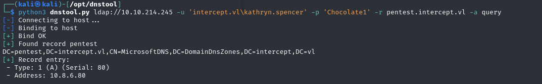 1 | python3 dnstool.py ldap://10.10.214.245 -u 'intercept.vl\kathryn.spencer' -p 'Chocolate1' -r pentest.intercept.vl -a query |