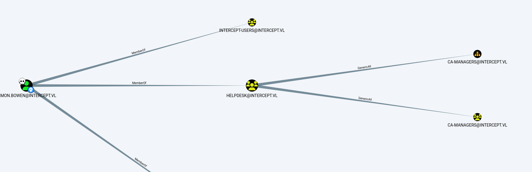 Bloodhound then lets us see that this account has GenericAll rights to the CA-Managers group, enabling it to add or remove members to this group.