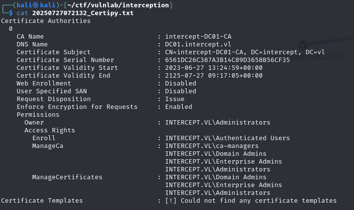 This vulnerability makes it possible to manually define an arbitrary UPN (User Principal Name), and thus have a certificate issued to any user, in this case administrator@intercept.vl.